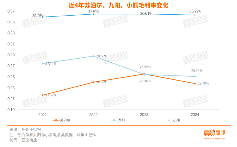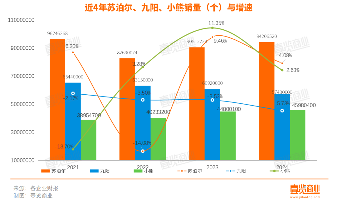 從營(yíng)收增幅看,蘇泊爾和小熊的增速跑贏大盤,蘇泊爾小家電板塊2024年?duì)I收同比增長(zhǎng)2.25%,小熊同比微增0.98%,九陽則是連續(xù)第四年下跌,且達(dá)到近五年最大跌幅,下滑7.98%。