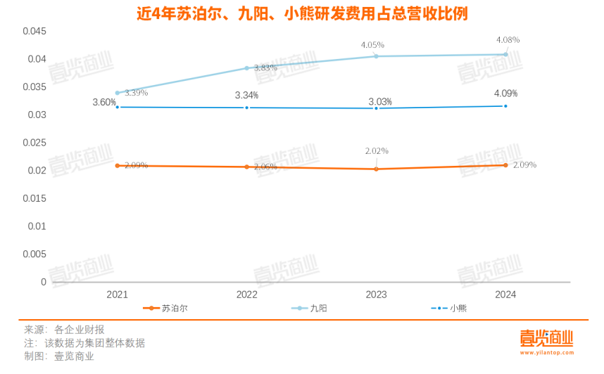 從財(cái)報(bào)數(shù)據(jù)看,不論是小熊、九陽還是蘇泊爾,研發(fā)投入占比均不足5%,其中,蘇泊爾研發(fā)費(fèi)用率最低,2024年僅為2.09%,換言之蘇泊爾的每100元營(yíng)收中研發(fā)投入僅2元。九陽同期的研發(fā)費(fèi)用率達(dá)4.08%,小熊為4.09%。