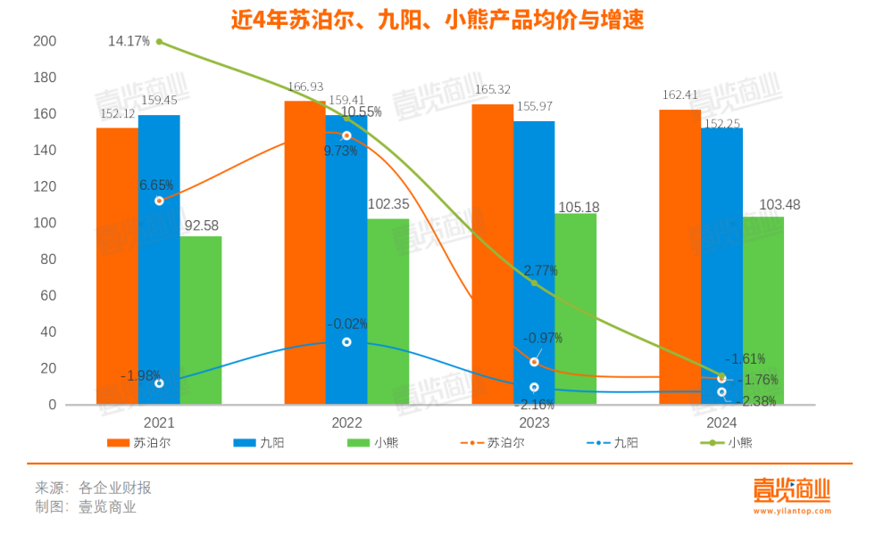 根據(jù)產(chǎn)品銷量和公司業(yè)務(wù)營(yíng)收計(jì)算,2024年,九陽和小熊的產(chǎn)品均價(jià)分別下滑2.38%、1.61%,九陽的產(chǎn)品均價(jià)連續(xù)4年下跌。銷量下滑疊加均價(jià)減少,造成的便是公司整體營(yíng)收狀況不佳,九陽和小熊2024年的營(yíng)收增速分別為-7.98%和0.98%。