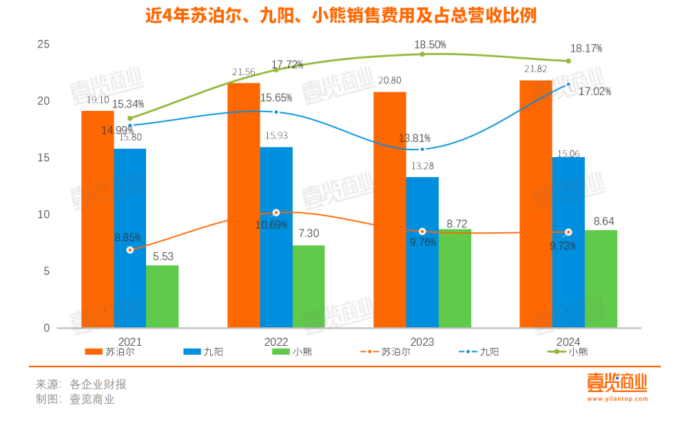即便二者都加大了營(yíng)銷端的投入,但結(jié)合營(yíng)收增長(zhǎng)來看,九陽和小熊在2024年做了很多無效營(yíng)銷。