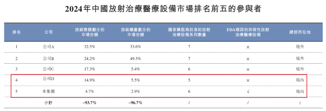 另據(jù)灼識(shí)咨詢數(shù)據(jù),在2024年中國(guó)放療醫(yī)療設(shè)備市場(chǎng)中,大醫(yī)集團(tuán)在境內(nèi)企業(yè)中排名第二,市占率為4.7%,而境內(nèi)排名第一的企業(yè)市占率已經(jīng)達(dá)到14.9%,遠(yuǎn)遠(yuǎn)領(lǐng)先于大醫(yī)集團(tuán)。