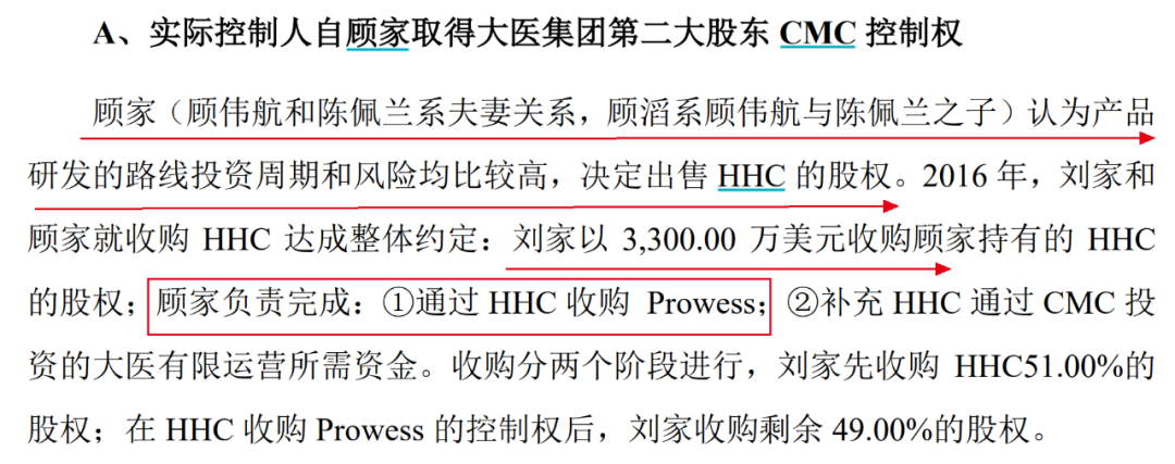 大醫(yī)集團(tuán)明確,2016年4月進(jìn)行一系列涉及CMC控股實(shí)體股權(quán)的交易后,劉怡辰拿下大醫(yī)集團(tuán)全部控制權(quán)。