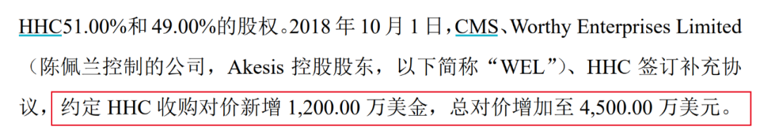 2018年10月,CMS、Akesis控股股東WEL(陳佩蘭控制)、HHC簽訂補(bǔ)充協(xié)議,約定HHC收購(gòu)對(duì)價(jià)新增1200萬美元,總收購(gòu)對(duì)價(jià)增加至4500萬美元。
