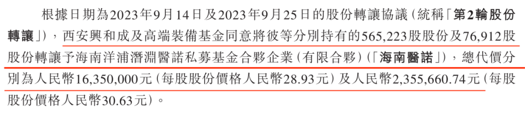 2023年,西安興和成及高端裝備基金將分別持有的56.52萬股股份及7.69萬股股份轉(zhuǎn)讓予海南醫(yī)諾,分別套現(xiàn)1635萬元、235.57萬元。其中,高端裝備基金是大醫(yī)集團(tuán)首輪融資中進(jìn)入的投資方。