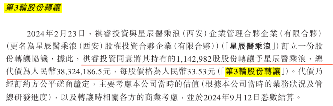 2024年2月,祺睿投資將其持有的114.30萬股股份轉(zhuǎn)讓予星辰醫(yī)乘浪,套現(xiàn)3832.42萬元,直接清倉(cāng)撤退。