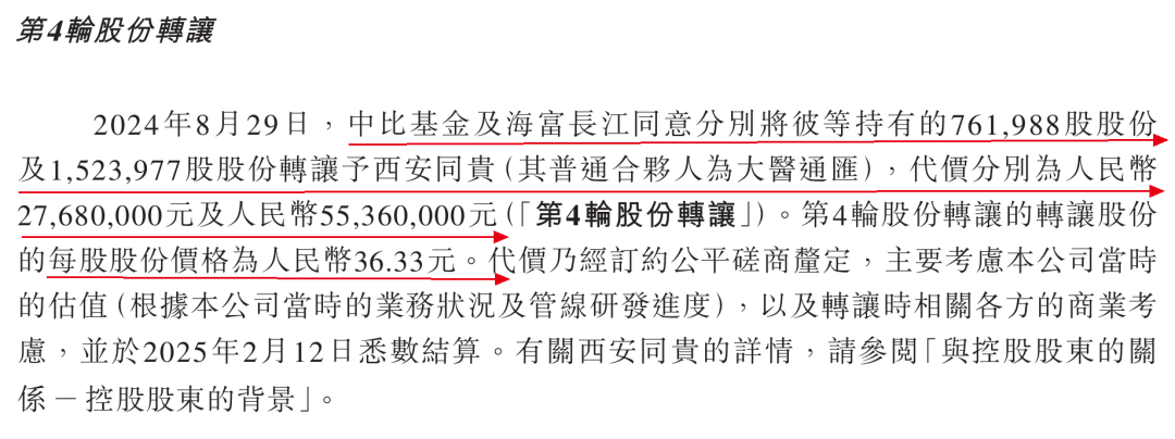 祺睿投資撤退半年后,即2024年8月,劉海峰家族實(shí)控的西安同貴親自出馬,收購(gòu)了中比基金及海富長(zhǎng)江約76.20萬股股份及152.40萬股股份,代價(jià)分別為2768萬元、5536萬元,每股價(jià)格為36.33元,這是大醫(yī)集團(tuán)IPO前所有股權(quán)轉(zhuǎn)讓、增資中單價(jià)最高的一次。