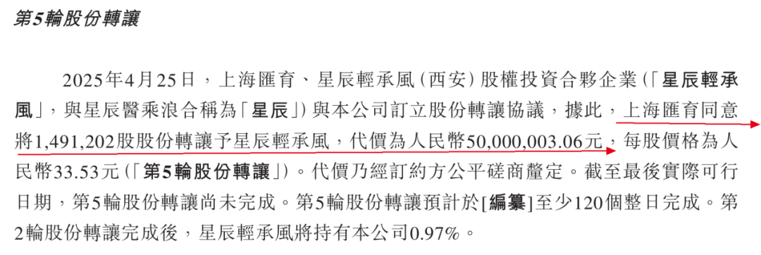 就在大醫(yī)集團(tuán)遞表港交所前3天,高瓴突然拋出轉(zhuǎn)讓部分股權(quán)的計(jì)劃。4月25日,高瓴旗下的上海匯育擬將149.12萬股股份轉(zhuǎn)讓予星辰輕承風(fēng),代價(jià)5000萬元。