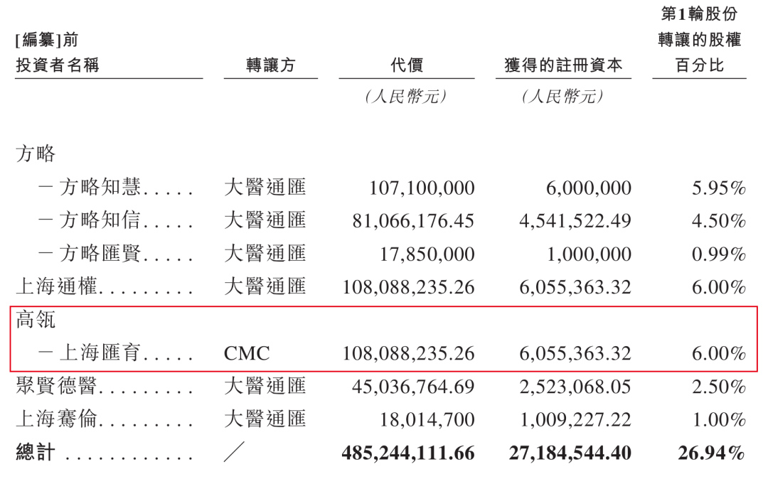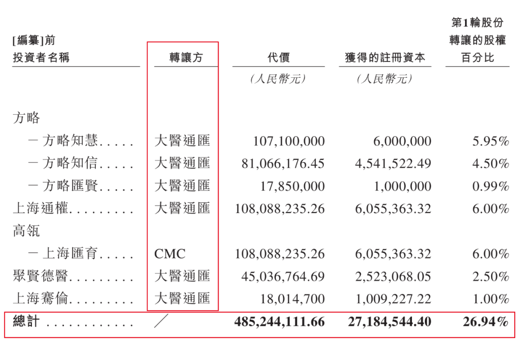 在引入高瓴等投資方之時(shí),劉海峰家族已經(jīng)賺得一筆。2019年,劉海峰家族實(shí)控的大醫(yī)通匯及CMC向方略與高瓴等投資方合計(jì)轉(zhuǎn)讓2718萬元注冊(cè)資本,套現(xiàn)4.85億元。