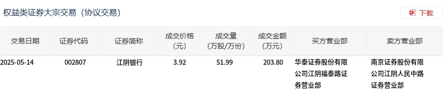 5月14日,江陰銀行大宗交易成交51.99萬股,成交額203.8萬元,占當(dāng)日總成交額的1.09%,成交價3.92元,較市場收盤價4.41元折價11.11%。