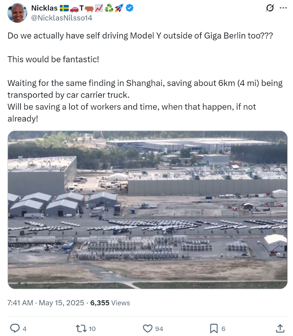 這位博主在對特斯拉柏林工廠的航拍中發(fā)現(xiàn)了一些細節(jié):圖片中一些新下線的Model Y正通過無人駕駛駛向配送區(qū)域。