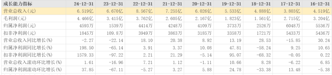 2023年~2024年,易明醫(yī)藥扣非凈利潤分別為109.8萬元和1845萬元,而2020年~2022年均保持在3000萬元以上;營收方面,易明醫(yī)藥2023年、2024年分別為6.67億元和6.52億元,同比均為下滑,2020年~2022年則連續(xù)同比上漲。