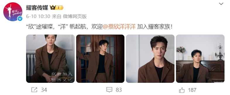 6月10日,制作人、演員張萌的經(jīng)紀公司耀客傳媒官宣簽約微短劇演員蔡欣洋。