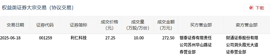 6月18日,利仁科技大宗交易成交10萬(wàn)股,成交額272.5萬(wàn)元,占當(dāng)日總成交額的4.19%,成交價(jià)27.25元,較市場(chǎng)收盤(pán)價(jià)25.52元溢價(jià)6.78%。
