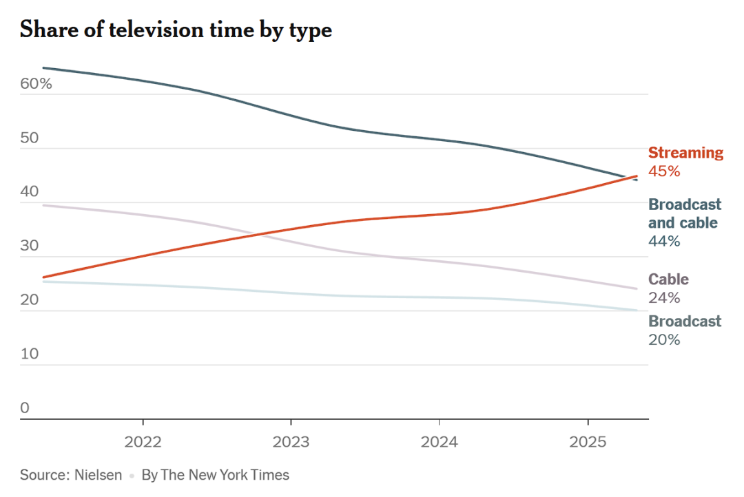 流媒體的未來已至,并且正成為現(xiàn)實。根據(jù)尼爾森周二發(fā)布的報告,2025年5月,美國人通過流媒體服務(wù)觀看電視的時長,首次在一個完整的月份里,超過了有線電視和廣播電視的總和。