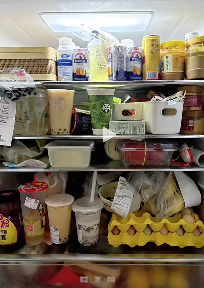 更有甚者,一次性點了七份外賣回來凍著,冰箱都塞滿了。光奶茶就有五杯,再加上外賣、還有零食小吃。這下子是一次性把一星期的口糧都解決了。