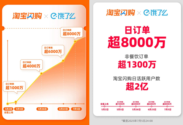 而淘寶閃購方面,500億補(bǔ)貼的作用非常明顯。7月7日,淘寶聯(lián)合餓了么宣布日訂單數(shù)超8000萬,非餐飲訂單超1300萬,淘寶閃購日活躍用戶超過2億。
