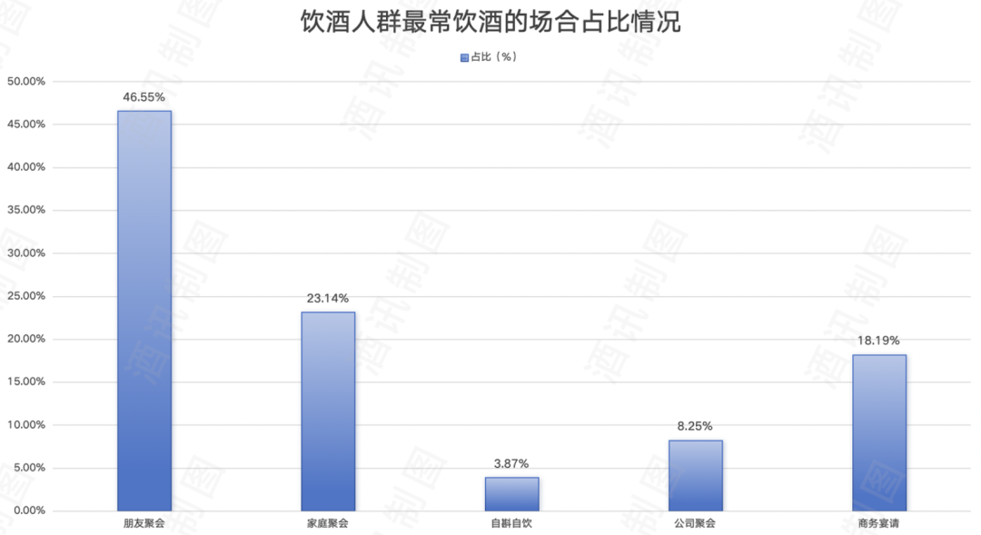 與此同時,以Z世代為主體的年輕消費群體崛起,他們的飲酒觀念和行為發(fā)生了深刻變化。數(shù)據(jù)顯示,超過80%的年輕消費者傾向中低度酒,其中59%追求“微醺不醉”的朦朧體驗?!?023中國適量飲酒快樂生活》藍(lán)皮書關(guān)于“最常飲酒的場合”結(jié)果是,朋友聚會(46.55%)、家庭聚會(23.14%)均在商務(wù)宴請(18.19%)之前。