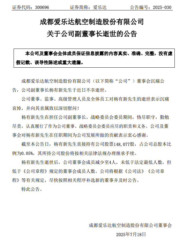 愛樂達(dá)7月18日晚間公告,公司董事會沉痛公告,公司副董事長楊有新于近日不幸逝世。截至本公告日,楊有新直接持有公司股票148,077股,占公司總股本比例為0.05%,其所持公司股份將按相關(guān)法律法規(guī)辦理繼承手續(xù)。