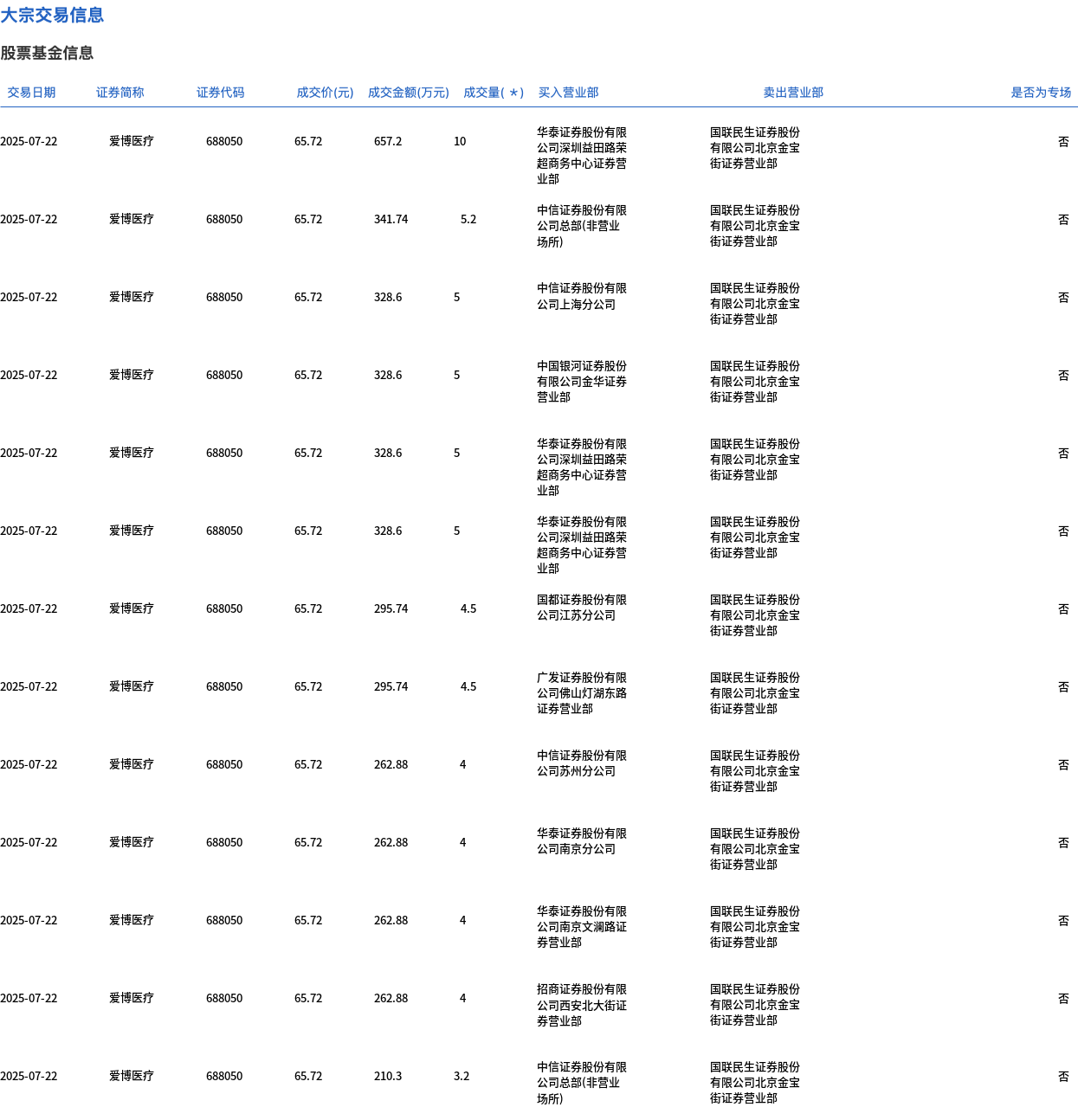 7月22日,愛博醫(yī)療大宗交易成交63.4萬股,成交額4166.64萬元,占當(dāng)日總成交額的16.52%,成交價65.72元,較市場收盤價70.43元折價6.69%。