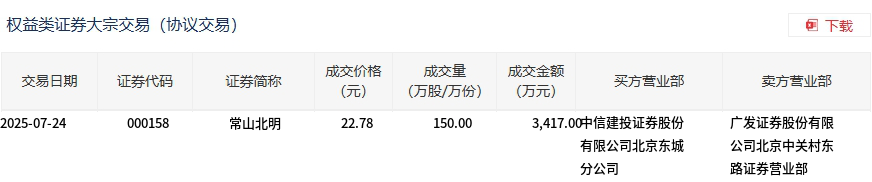 7月24日,常山北明大宗交易成交150萬(wàn)股,成交額3417萬(wàn)元,占當(dāng)日總成交額的2.17%,成交價(jià)22.78元,較市場(chǎng)收盤價(jià)23.24元折價(jià)1.98%。