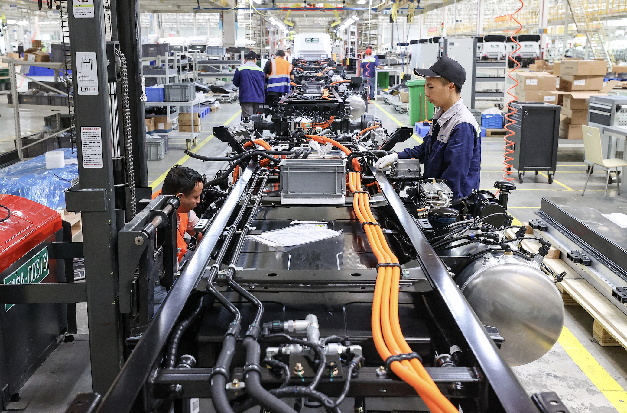2025年7月2日,貴州省貴安新區(qū),工人在一家新能源汽車制造企業(yè)總裝車間安裝新能源輕卡車電池。圖片來源:CFP
