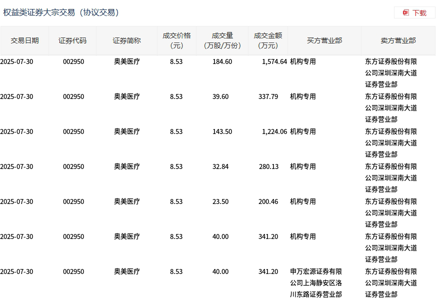 7月30日,奧美醫(yī)療大宗交易成交504.04萬股,成交額4299.48萬元,占當日總成交額的43.58%,成交價8.53元,較市場收盤價9.31元折價8.38%。