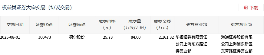 8月1日,德爾股份大宗交易成交84萬股,成交額2161.32萬元,占當(dāng)日總成交額的17.29%,成交價25.73元,較市場收盤價30.26元折價14.97%。