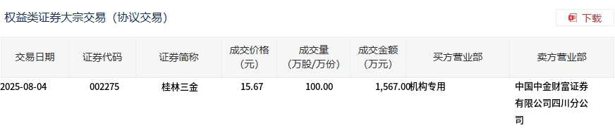 8月4日,桂林三金大宗交易成交100萬股,成交額1567萬元,占當日總成交額的6.01%,成交價15.67元,較市場收盤價15.8元折價0.82%。
