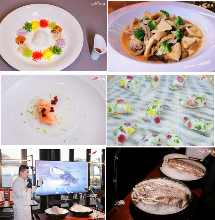 本次宴席以摩洛哥墨魚(yú)為核心,通過(guò)刺身、熱烹、水餃等打造了20多款菜式:酸辣暖胃酸辣烏魚(yú)蛋湯、濃郁咸鮮里岔黑豬排燒墨魚(yú)、清爽咸鮮爆炒墨魚(yú)片、原汁原味墨汁燒墨魚(yú)、謝霆鋒聯(lián)名“星光熠熠”鮮花墨魚(yú)蒸餃……每一款都能品嘗到摩洛哥墨魚(yú)的魅力,展現(xiàn)從深海到餐桌的食材本味,品味船歌墨魚(yú)水餃原料的用心。