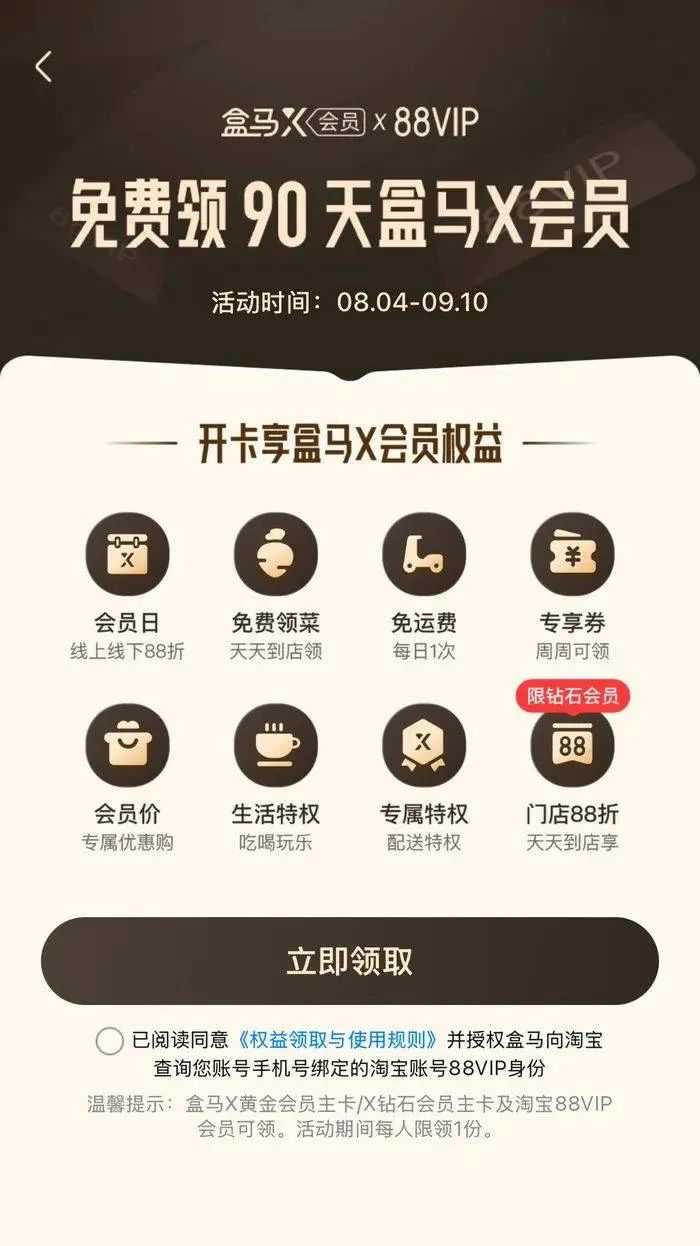 此外,淘寶大會員還可以與88VIP會員權(quán)益實現(xiàn)疊加。在淘寶大會員推出之后,88VIP在餓了么、飛豬、高德、盒馬等平臺的上的權(quán)益也更加豐富,目前,淘寶88VIP用戶可領(lǐng)取一張有效期為90天的盒馬X會員體驗卡,能夠體驗盒馬X會員的免運費、會員日88折、每日領(lǐng)取免費菜等福利。