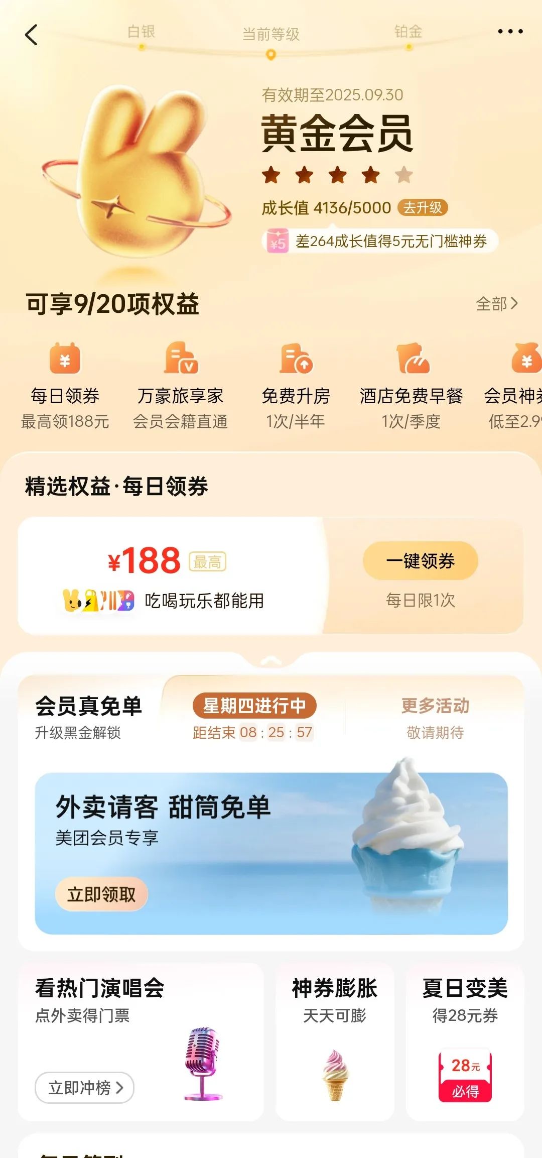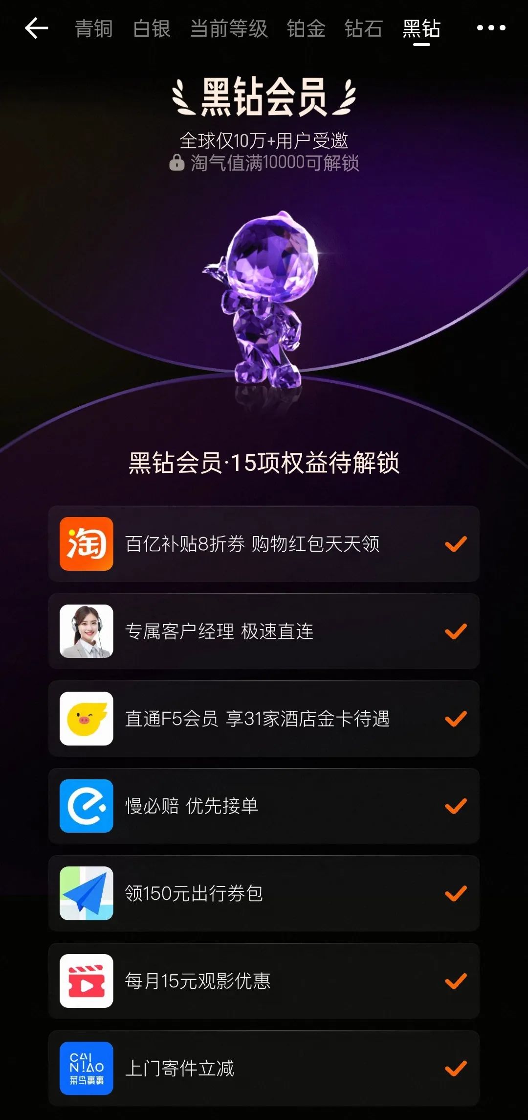 目前,大會員分為青銅、白銀、黃金、鉑金、鉆石、黑鉆6個等級。不同等級對應(yīng)不同的專屬優(yōu)惠和服務(wù),用戶可免費獲取,涵蓋購物折扣、外賣權(quán)益、旅行禮遇、打車優(yōu)惠等。