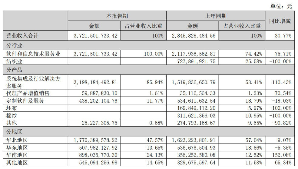 常山北明本期營業(yè)收入分行業(yè)來看,軟件和信息技術(shù)服務(wù)業(yè)實現(xiàn)營業(yè)收入37.22億元,占營業(yè)收入比重100%,與上年同期相比增加75.71%;紡織業(yè)實現(xiàn)營業(yè)收入為零,與上年同期相比減少100%。