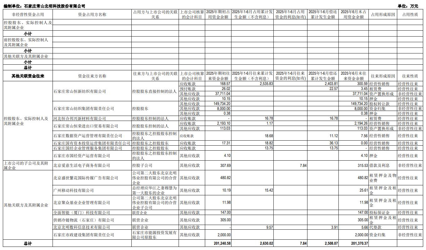 在披露2025年半年度報告的同時,常山北明還公布了2025年半年度非經(jīng)營性資金占用及其他關(guān)聯(lián)資金往來的匯總情況。
