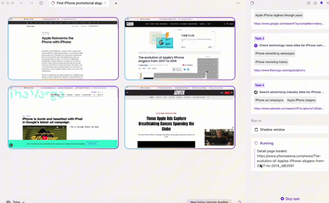 比如國外的Comet、Dia可跨網(wǎng)站執(zhí)行多步任務操作,F(xiàn)ellouAI更是號稱“全球首個行動型瀏覽器”,用戶給出“在亞馬遜搜RTX4060顯卡,并按評分加購最高型號”的指令,F(xiàn)ellouAI會自動執(zhí)行“登錄-篩選-比價-下單”整個過程。