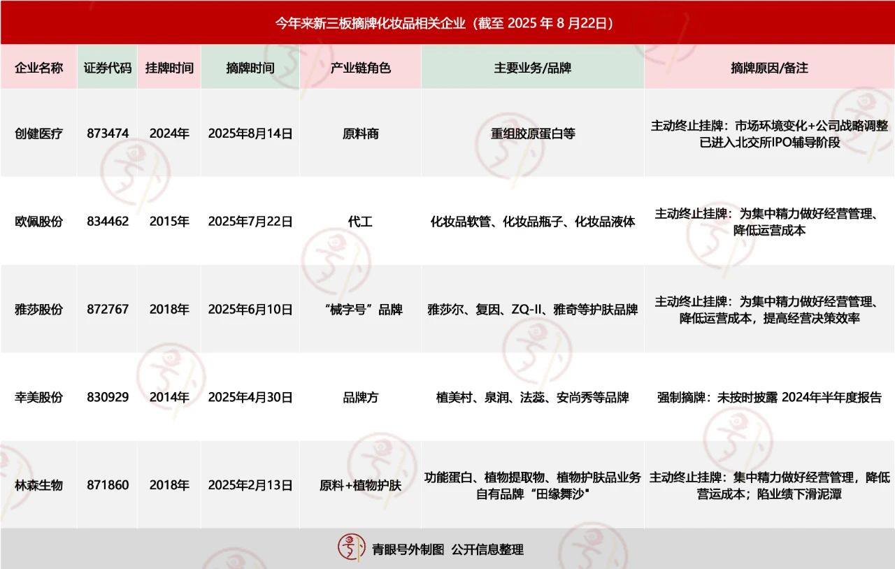 近年來,作為資本市場“孵化器”的新三板,在美妝產(chǎn)業(yè)鏈中的角色由熱轉(zhuǎn)冷。據(jù)青眼號外不完全統(tǒng)計(jì),今年來,包括歐佩股份在內(nèi),已有5家化妝品相關(guān)企業(yè)從新三板摘牌。