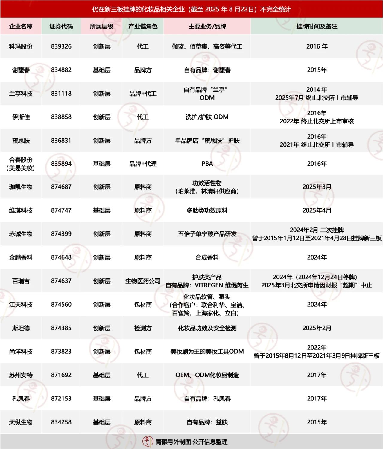 而隨著這些企業(yè)摘牌,據(jù)青眼號外不完全統(tǒng)計(jì),新三板掛牌化妝品相關(guān)企業(yè)不足20家,涵蓋代工、原料、包裝、檢測等環(huán)節(jié),整體活躍度下降明顯。