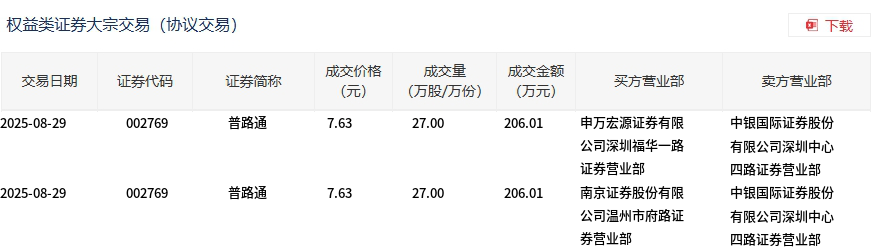 8月29日,普路通大宗交易成交54萬股,成交額412.02萬元,占當(dāng)日總成交額的4.2%,成交價(jià)7.63元,較市場(chǎng)收盤價(jià)8.4元折價(jià)9.17%。
