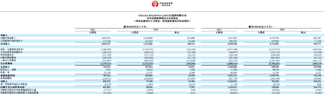 上半年,霸王茶姬實(shí)現(xiàn)營業(yè)收入67.25億元,同比增長21.61%;但凈利潤只有7.55億元,同比降幅高達(dá)38.22%;經(jīng)調(diào)整凈利潤為13.07億元,同比增長了6.78%。其中,今年第二季度,其收入為33.32億元,同比增長10.2%;凈利潤為7723.8萬元,同比下滑87.72%,經(jīng)調(diào)整凈利潤為6.30億元,同比微增0.1%%。
