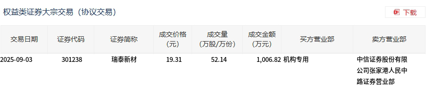 9月3日,瑞泰新材大宗交易成交52.14萬(wàn)股,成交額1006.82萬(wàn)元,占當(dāng)日總成交額的2.74%,成交價(jià)19.31元,較市場(chǎng)收盤(pán)價(jià)19.55元折價(jià)1.23%。