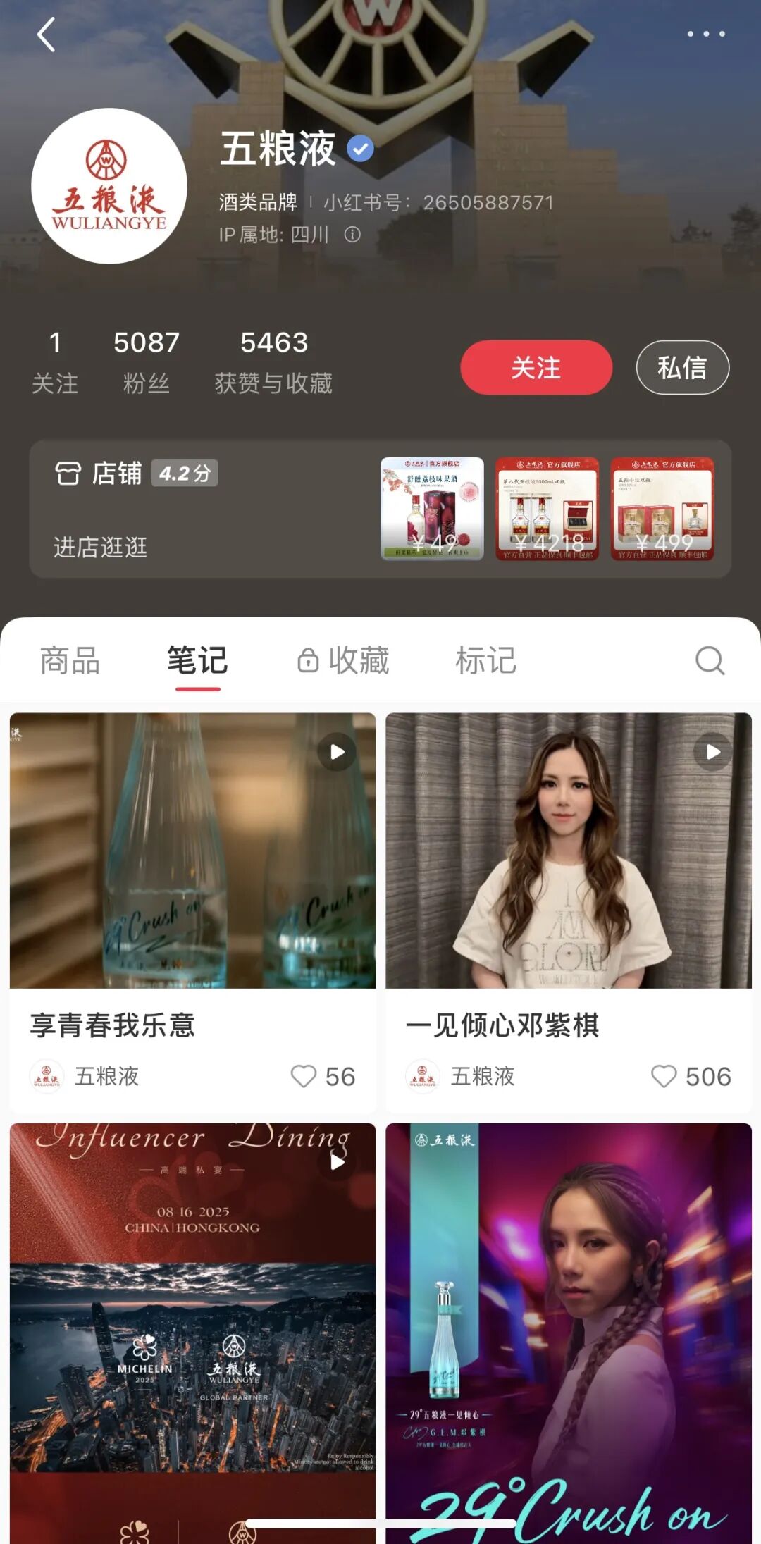 在營(yíng)銷玩法上,五糧液的表現(xiàn)也顯得保守單一,未能掌握時(shí)下年輕人的流量密碼。 目前來(lái)看,“29°五糧液一見傾心” 在各個(gè)社交平臺(tái)都有一定曝光,但除了鄧紫棋粉絲曬圖,幾乎沒(méi)有其他創(chuàng)意玩法。在女性用戶聚集的小紅書,甚至五糧液官方號(hào)只有五千多粉絲,仿佛一個(gè)“僵尸號(hào)”。已有的曝光內(nèi)容,也更多集中在鄧紫棋粉絲群體中,尚未突破圈層觸達(dá)更廣泛的消費(fèi)人群。