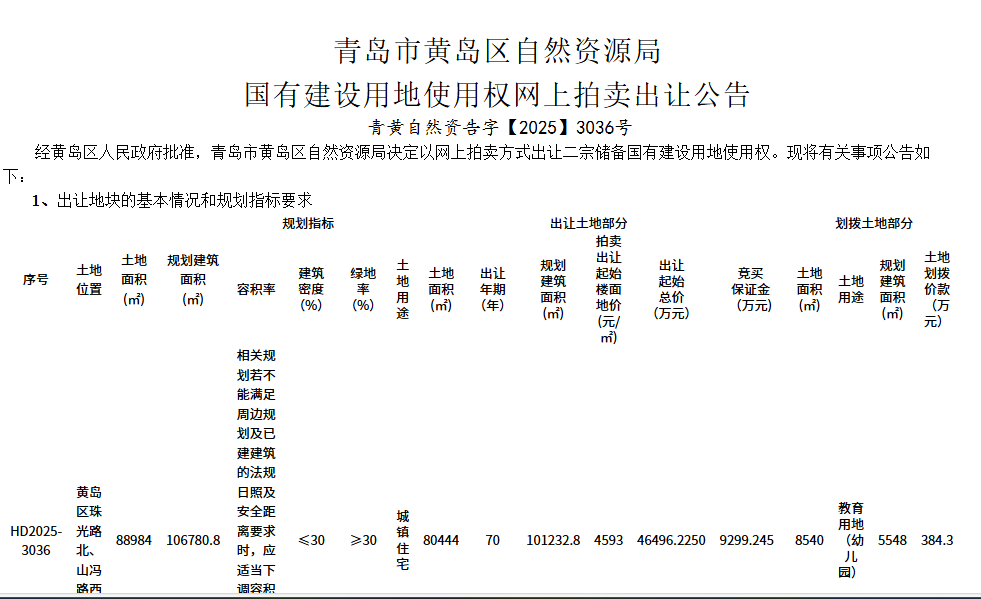 位于靈山灣朝陽(yáng)山片區(qū)的珠光路北側(cè)地塊(編號(hào):HD2025-3036)由青島公元置業(yè)有限公司競(jìng)得,成交總價(jià)4.65億元,折算樓面地價(jià)為每平方米4593元。根據(jù)土地出讓公告,該地塊土地面積約8.04萬(wàn)平方米,規(guī)劃建筑面積約10.12萬(wàn)平方米,容積率僅為1.26,屬低密度住宅用地,預(yù)計(jì)未來(lái)將規(guī)劃建設(shè)洋房、疊拼等改善型產(chǎn)品。根據(jù)要求,地塊內(nèi)還需劃撥約5548平方米用地用于配建幼兒園。