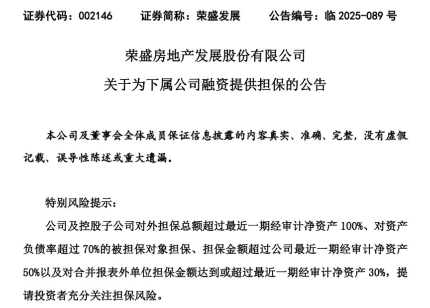 據(jù)悉,截至2025年9月24日,榮盛發(fā)展實(shí)際擔(dān)??傤~為441.27億元,占公司最近一期經(jīng)審計(jì)凈資產(chǎn)的297.05%。其中公司及其控股下屬公司對合并報(bào)表外單位提供的實(shí)際擔(dān)保余額77.56億元,占公司最近一期經(jīng)審計(jì)凈資產(chǎn)的52.21%,公司逾期擔(dān)保金額為102.51億元。