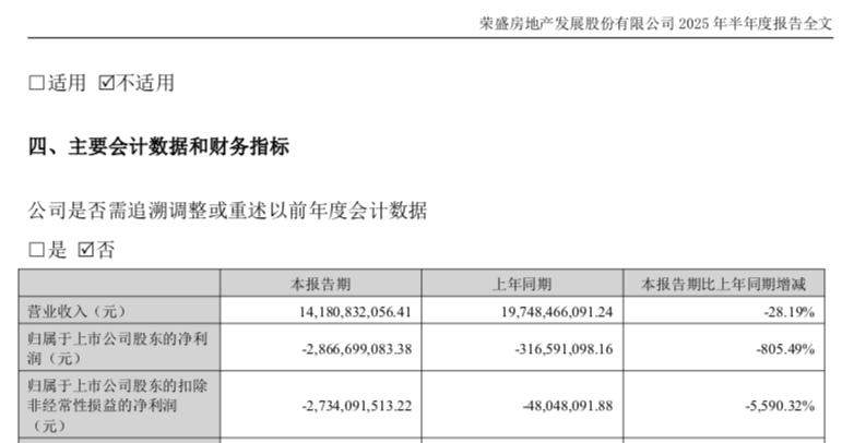 業(yè)績方面,榮盛發(fā)展2025年上半年歸屬于上市公司股東的凈利潤為-28.67億元,同比減少805.49%,歸屬于上市公司股東的扣除非經(jīng)常性損益的凈利潤為-27.34億元,同比減少5,590.32%。