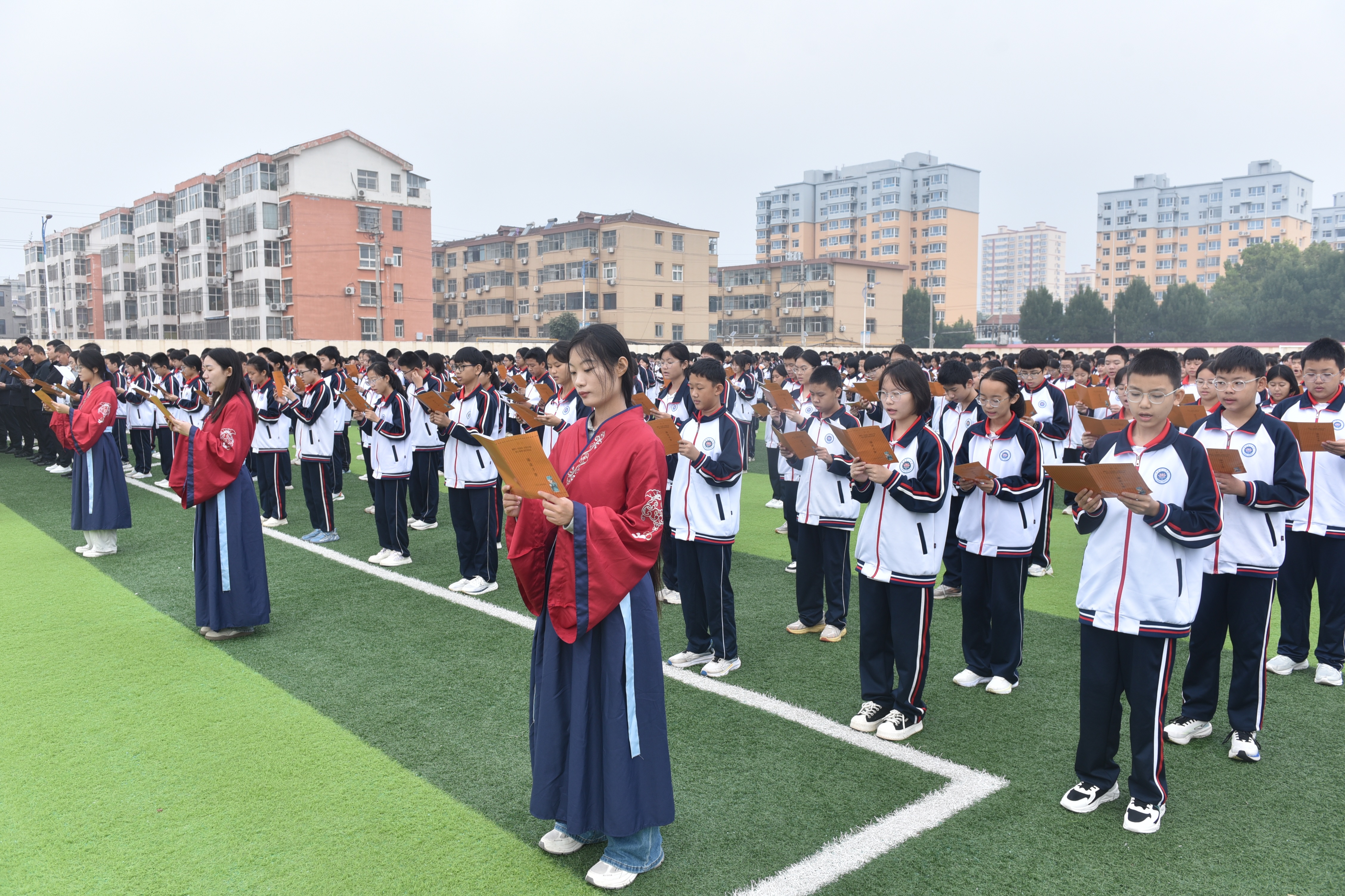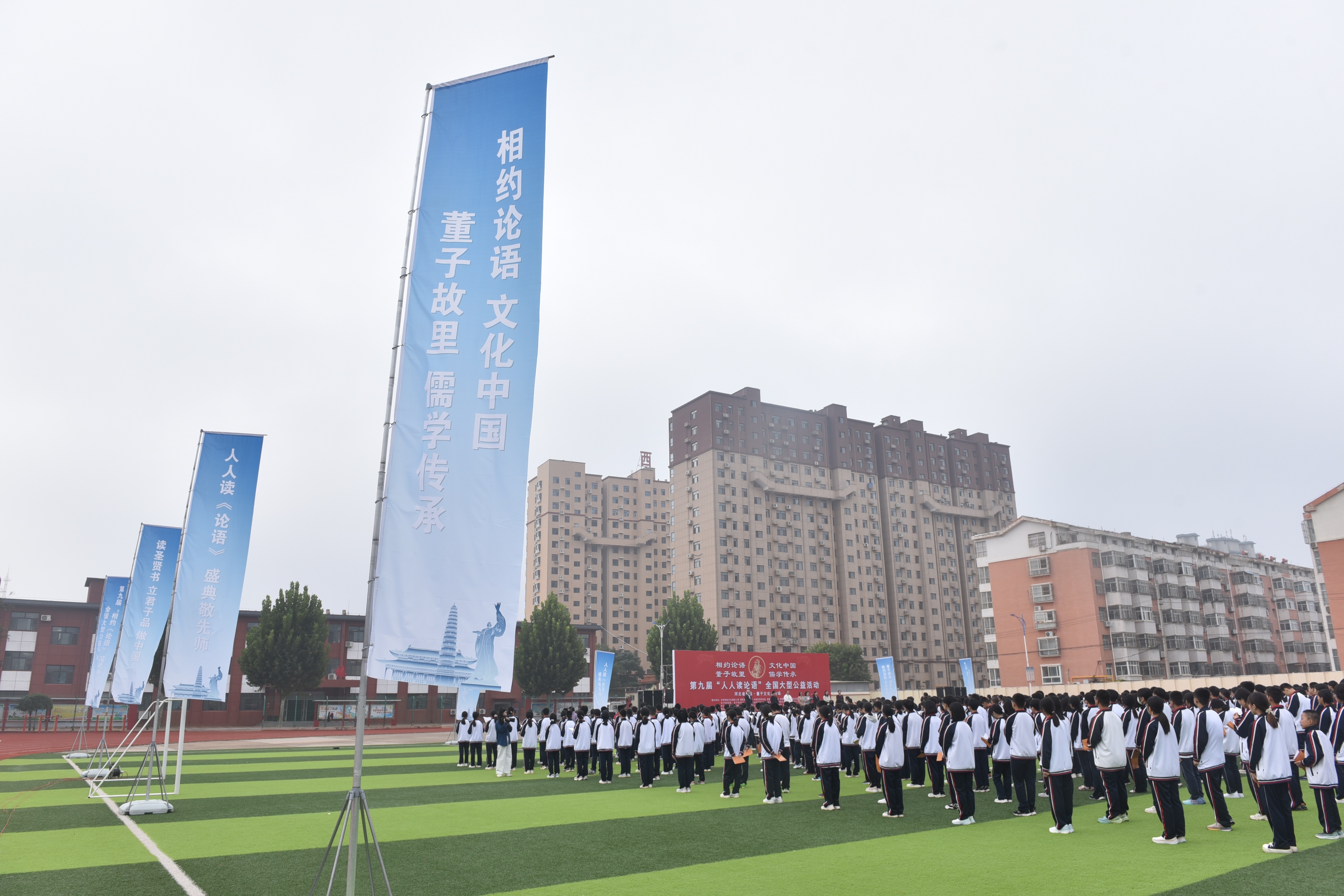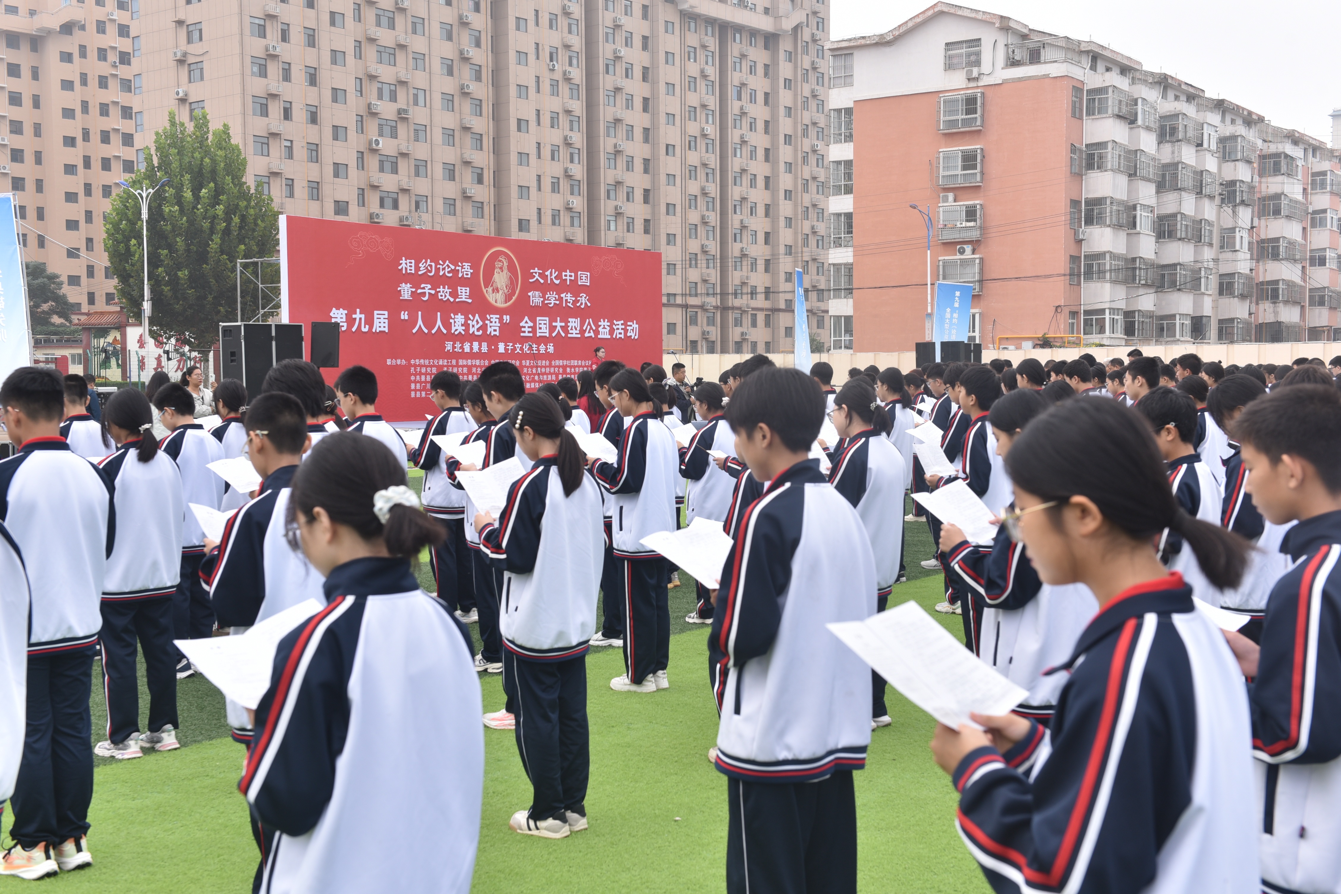 “士不可以不弘毅,任重而道遠?!薄皽毓识拢梢詾閹熞印!薄诨顒又鲿鼍翱h第二中學的操場上,3000余名師生齊聲誦讀《論語》經(jīng)典篇章與董子語錄,抑揚頓挫、鏗鏘有力的誦讀聲響徹校園上空,久久回蕩。同時,景縣任重完全小學、第二完全小學、第五完全小學、第三中學、景州鎮(zhèn)聯(lián)小等學校作為分會場同步開展誦讀,更有企業(yè)職工代表踴躍參與,總?cè)藬?shù)達近萬人。
