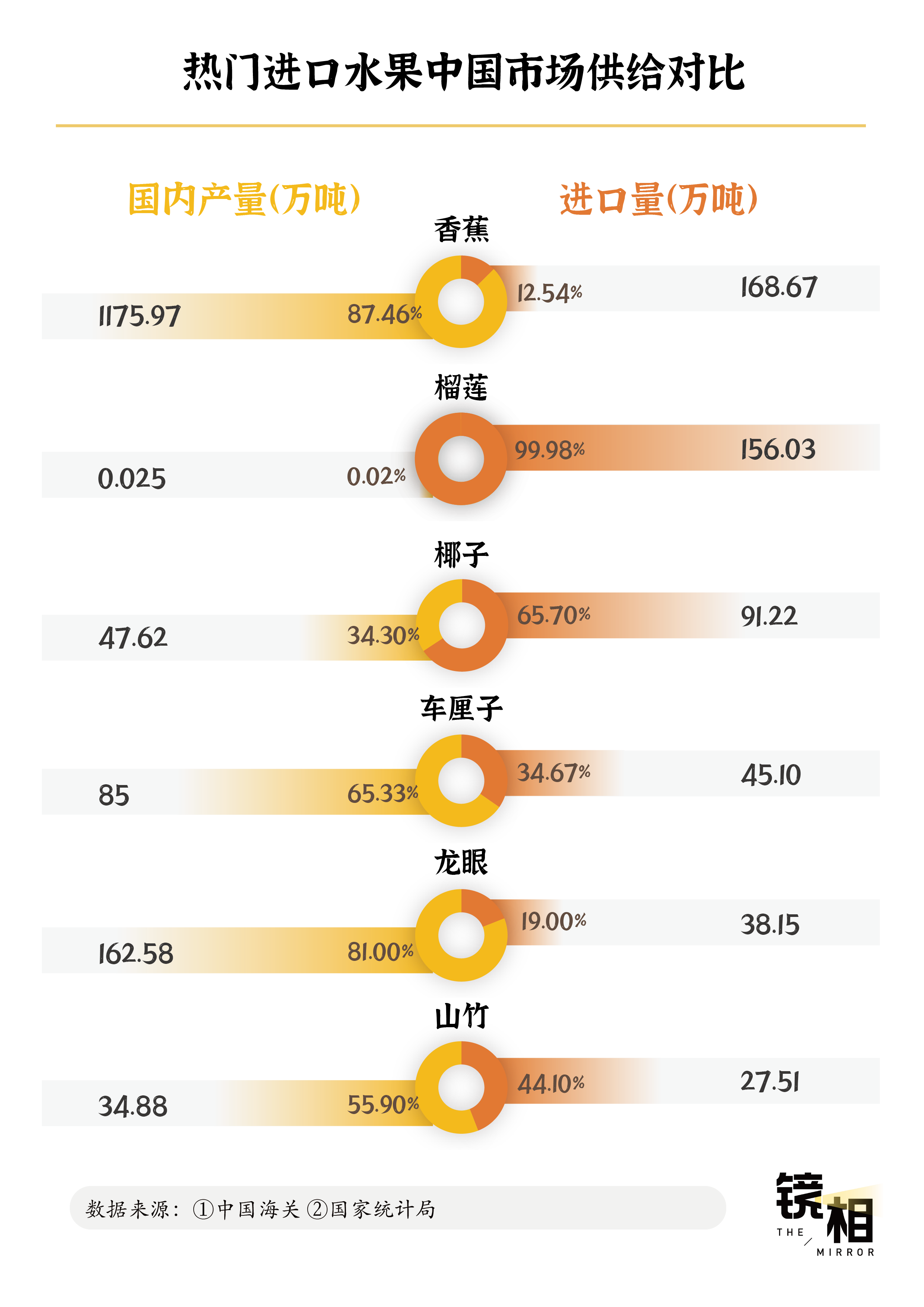 盡管中國的水果產(chǎn)量豐厚,但中國仍然是水果的凈進(jìn)口國,2024年進(jìn)口量818.4萬噸,是出口量的1.5倍。一方面,消費(fèi)者想要吃到非當(dāng)季的、多品種的水果;另一方面,水果賣家想延長(zhǎng)銷售期、減少耗損率,而進(jìn)口水果商業(yè)化程度高,自然就成了兩全其美的選擇。如今,中國市場(chǎng)上的水果消費(fèi)有7%依賴進(jìn)口。