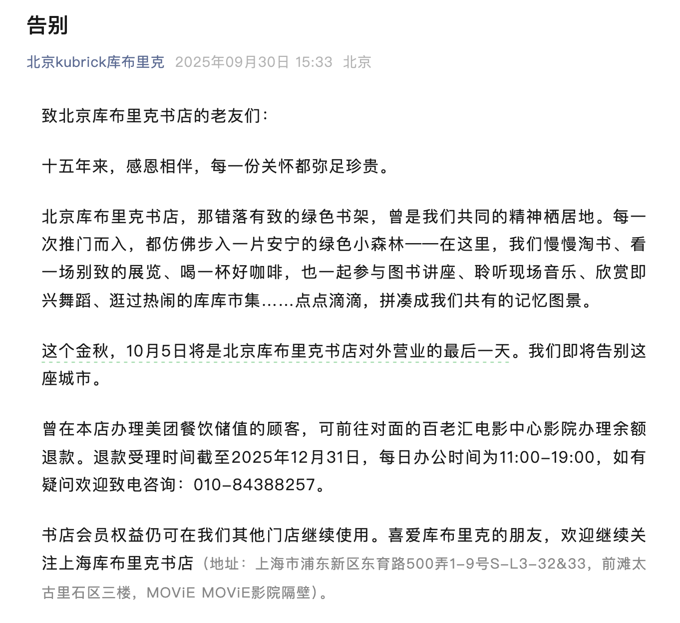 2025年9月30日,庫布里克書店通過官微“北京Kubrick”發(fā)布《告別》一文,證實(shí)了關(guān)店的傳聞。文中表示,書店閉店之后,原址將進(jìn)行裝修改造,“預(yù)計(jì)于11月初以‘和美生活美學(xué)空間’的身份重新啟程?!?/p>
