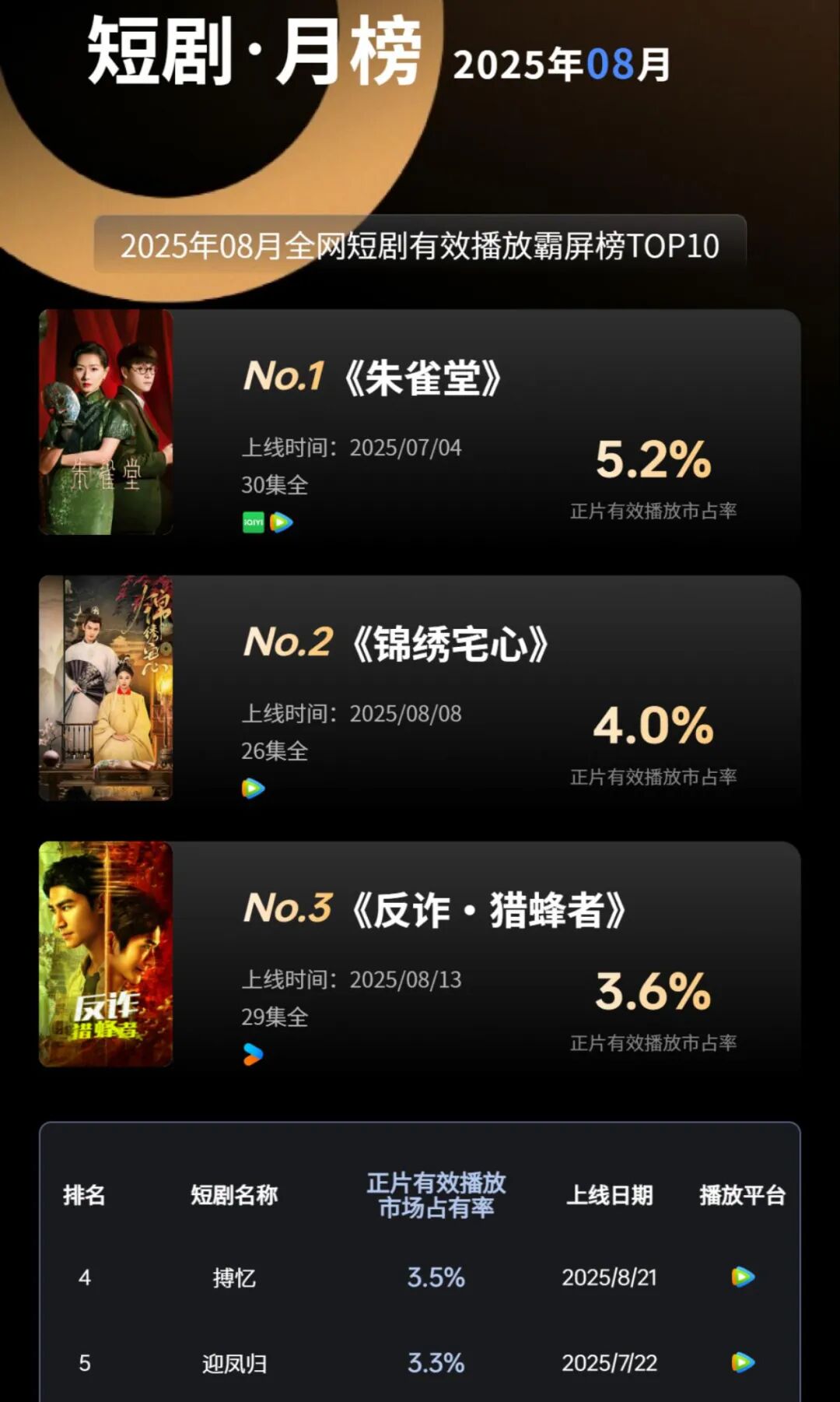 8月,以“AI +真人實(shí)拍”形式呈現(xiàn)的《龍門訣之大漠風(fēng)云變》,開播僅三天就沖上貓眼短劇熱度榜TOP2,緊隨其后的《反詐·獵蜂者》更是在上線次日便一舉登頂榜首,并以3.6%正片有效市占率躋身云合8月全網(wǎng)短劇有效播放霸評榜TOP3,為優(yōu)酷在騰訊視頻、愛奇藝等的重重圍堵下蹚出了一條路。