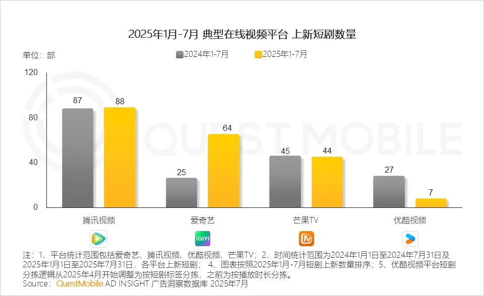 QuestMobile數(shù)據(jù)顯示,2025年1—7月優(yōu)酷僅上新了7部短劇,數(shù)量對比去年同期不僅沒有上升,甚至縮水超74%;而騰訊視頻、愛奇藝、芒果TV分別上新了88部、64部、44部,其中愛奇藝同比增幅高達(dá)156%。