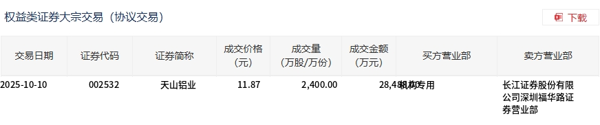 10月10日,天山鋁業(yè)大宗交易成交2400萬股,成交額2.85億元,占當日總成交額的30.84%,成交價11.87元,較市場收盤價11.81元溢價0.51%。