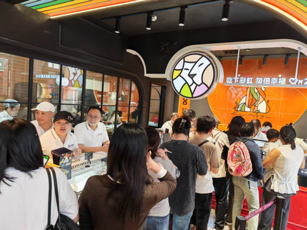 為與百年建筑完美融合,“打包幸?!眻F(tuán)隊(duì)耗費(fèi)了三個(gè)月時(shí)間,推翻了四五版設(shè)計(jì)稿,最終打造出這家全新的彩虹主題概念店。店鋪裝修融合了巴洛克元素與品牌自身的彩虹主題,為更契合街區(qū)的歷史韻味,團(tuán)隊(duì)還特別創(chuàng)作了一尊精美的翻糖神女像,吸引了不少游客市民駐足拍照。胡秀貝介紹,這件作品制作復(fù)雜,歷時(shí)近100天,“如果不去碰觸它,可以保存百年以上”。